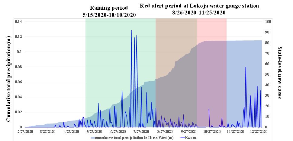 Figure 7. Covid-19 cases in Kwara states and cumulative precipitation in Ilorin West in Nigeria